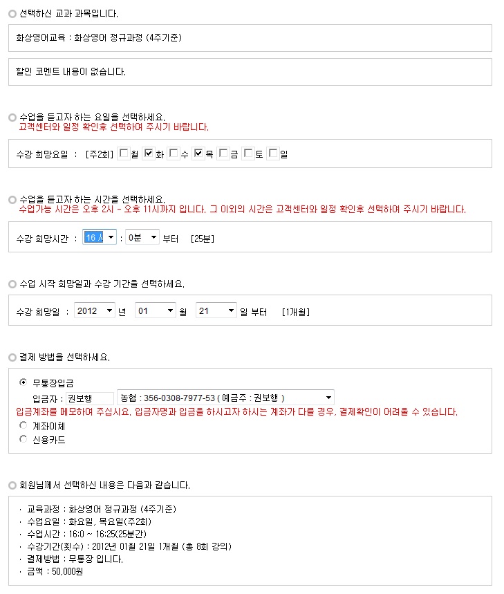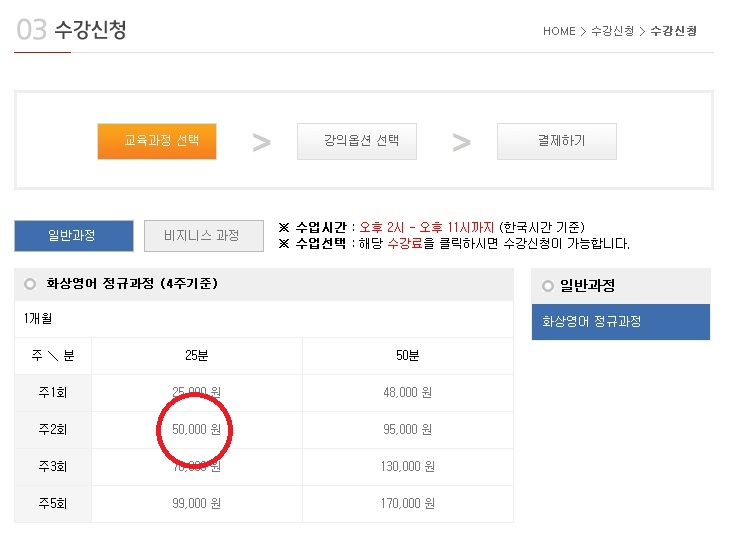 주2회 25분 수업을 선택하는 경우 아래 이미지와 같습니다.