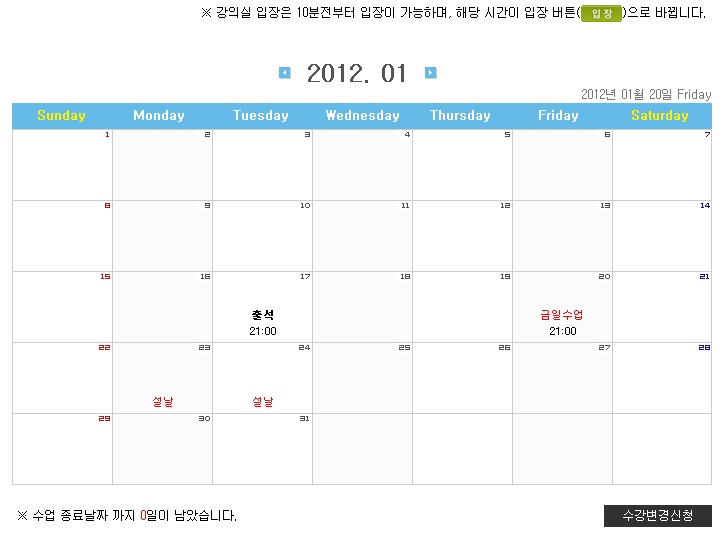 해당 날짜에 시간이 표시되었다가 수업 시작 10분전에 입장이라는 단추로 바뀌게 됩니다.