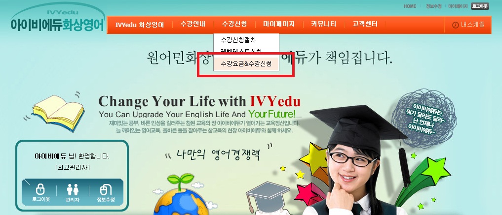 먼저 홈페이지 상단의 " 수강신청 - 수강신청&수강요금 " 을 선택 합니다.