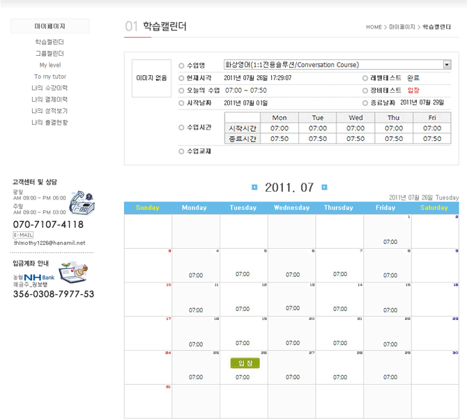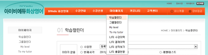 로그인 후 마이페이지의 서브메뉴인 학습캘린더를 클릭합니다